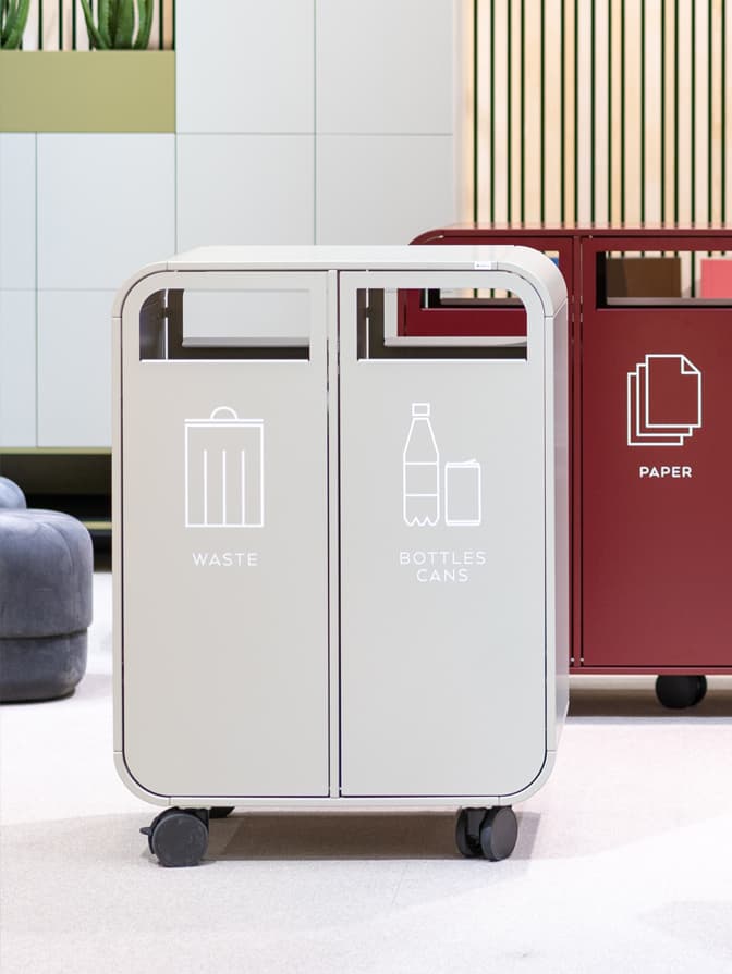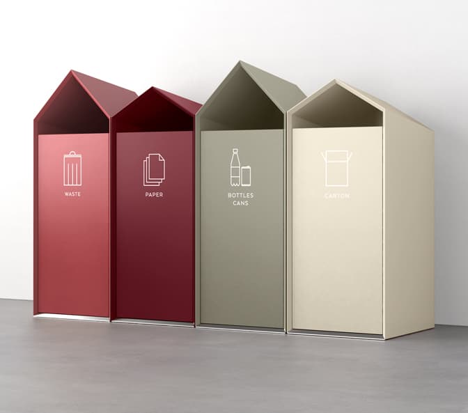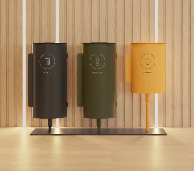 Återvinningskärl har ett gott syfte men det ser inte särskilt välkomnande eller inspirerande ut med en stor plasttunna i receptionen eller i kontorslandskapet. Det kan ge ett tråkigt första intryck för kunder och bidra till en dyster arbetsmiljö för medarbetarna. Av den anledningen har vi tagit fram ett sortiment av väldesignade sorteringskärl som passar in på de flesta kontor. Ni väljer fritt vilka kärl som passar bäst in i er verksamhet men vi hjälper så klart gärna till med tips och rådgivning.